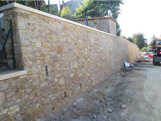 Travaux de maçonnerie – Réalisation d’un mur en pierre de moellons calcaire récupérer sur le site. Tête de mur réalisé en pierre de taille calcaire type Lavoux – Enduit à la chaux avec du sable de vienne.